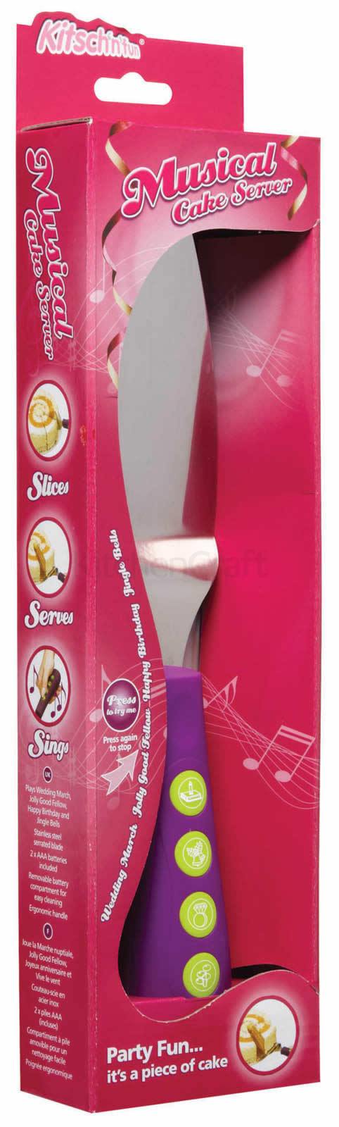 Ideal for all party occasions, each cake server plays four party tunes; 'Happy Birthday', 'Jingle Bells', 'The Wedding March', and 'For He Is A Jolly Good Fellow'.